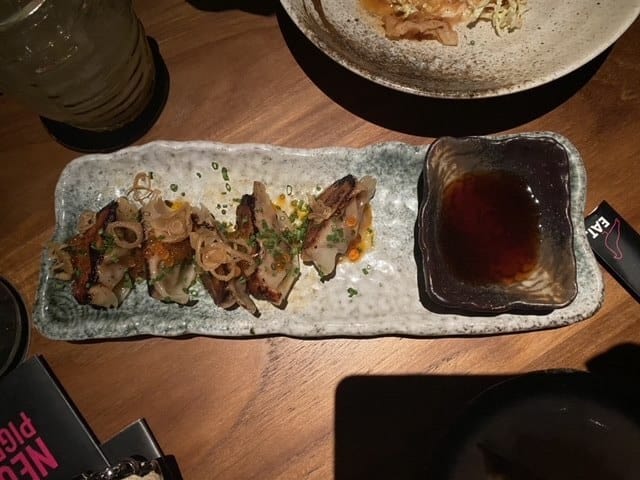 Let’s get some food: There is no menu starter and leading course standard. Instead, it has various food groups, like a raw bar or a robata grill. You pick whatever you like and share. After some advice from the staff, we settled for five dishes. To my surprise, it didn’t take long before the first two dishes arrived.