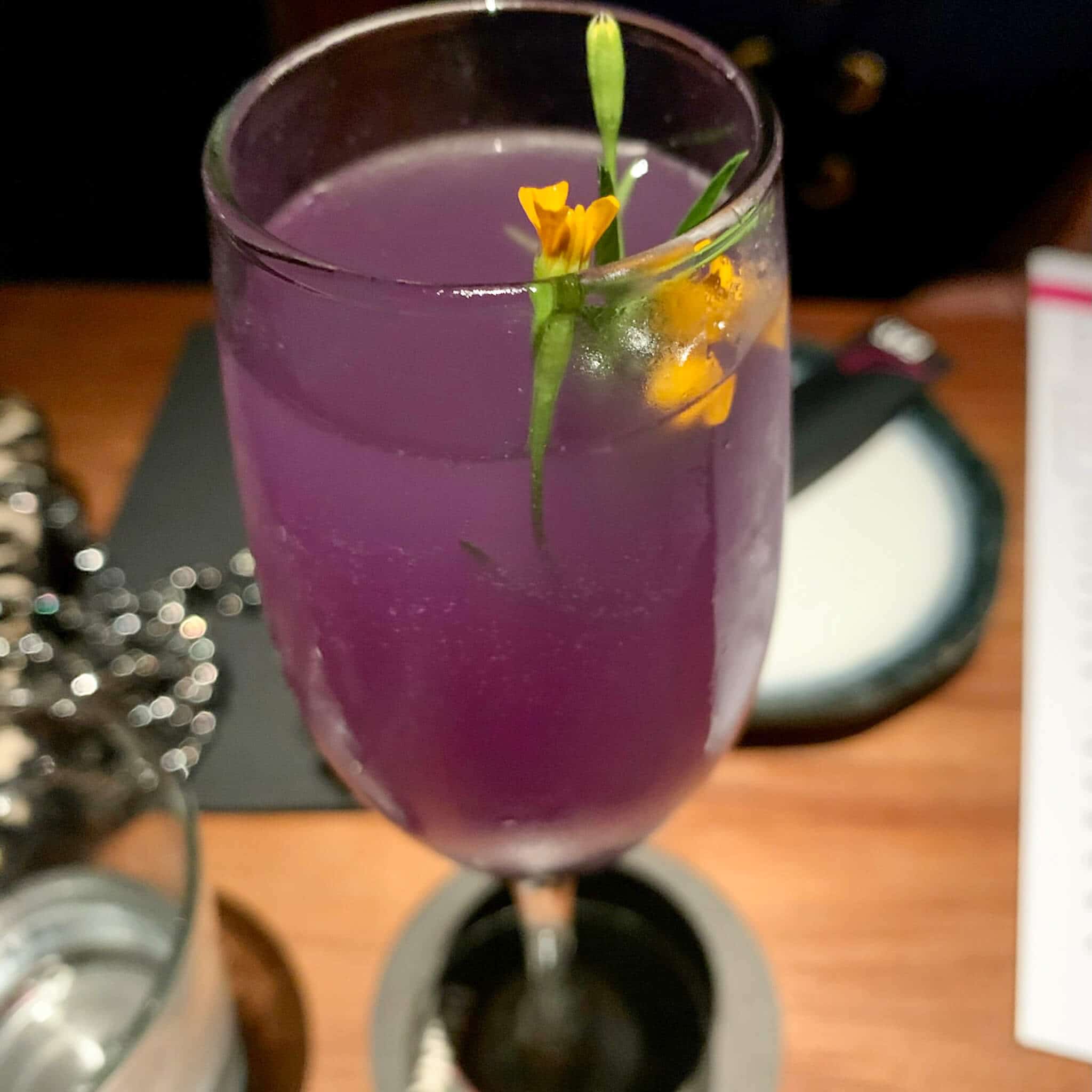 Rachel picked a “seatbelt and sake”, a purple concoction with a beautiful little flower. My choice was a “Lady Hinata”, described as a complex floral non-alcoholic gin drink; it was a good choice, as it turned out it was the only drink we had on the night besides our sparkling water.