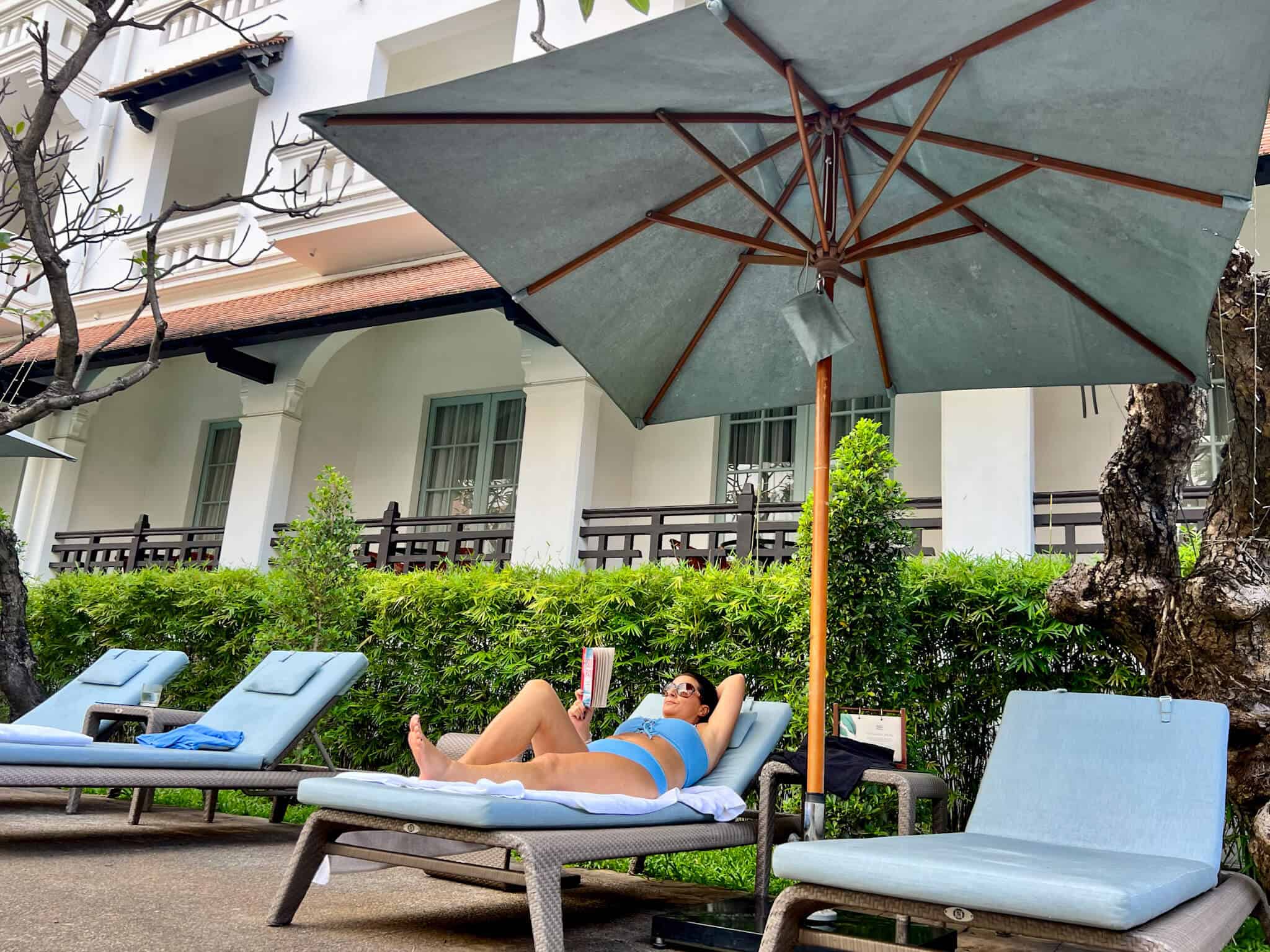 Our room was beautiful, overlooking the pool with a little verandah. The French Colonial Art Deco decor was everywhere, from the old-fashioned phone to the gorgeous marble bathroom; the room had an old-world glamour you rarely see in hotels today. Our bed was comfortable, our bathroom was spacious, and the ambience was generally luxuriously relaxed.